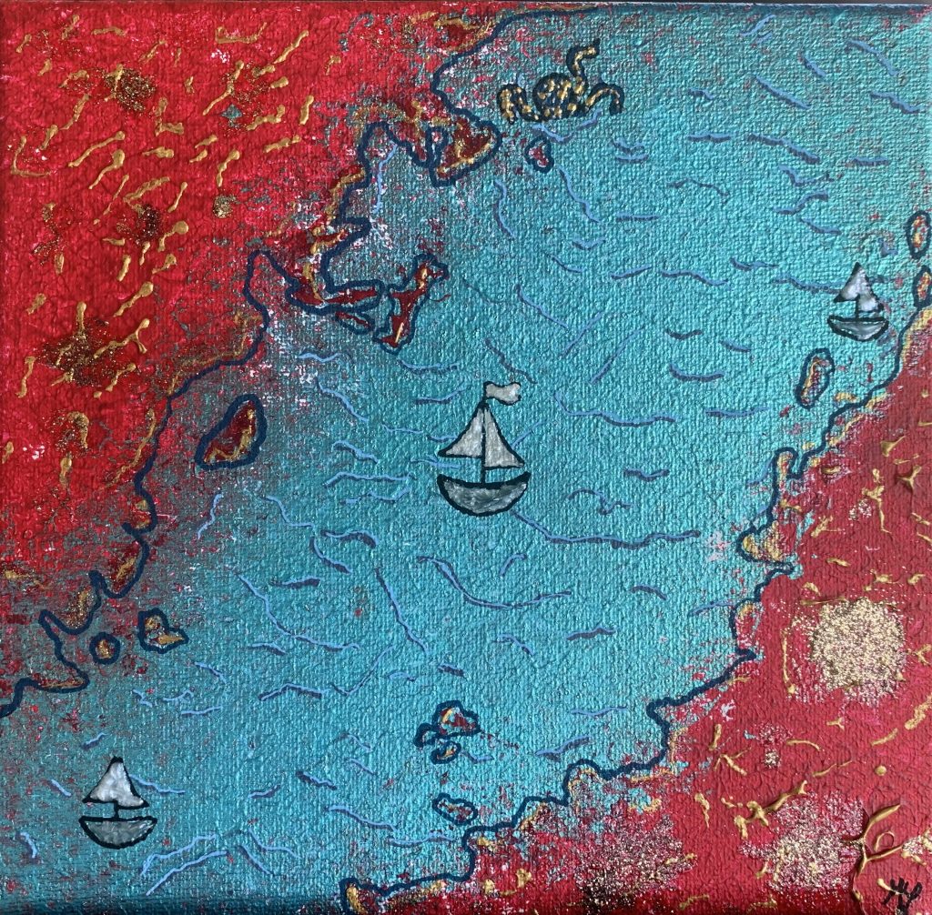 Peu après, elle revient vers moi, l’air pensif. Elle me confie qu’en observant plus attentivement son tableau, elle a l’impression de voir une rivière vue du ciel, avec les terres rouges du sud de la Nouvelle-Calédonie qui se dessinent dans le bleu. Elle me dit qu’elle aimerait ajouter des bateaux sur cette rivière calme, ce qu’elle fait avec une grande application.
