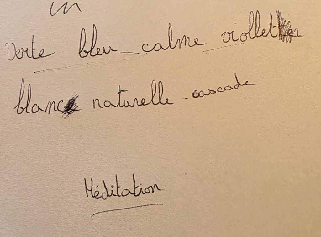 Nous avons noté les mots qui émergeaient : calme, volonté, méditation, amour, nature, joie… Ce temps permet d’ouvrir l’imaginaire et de poser une base symbolique commune.
